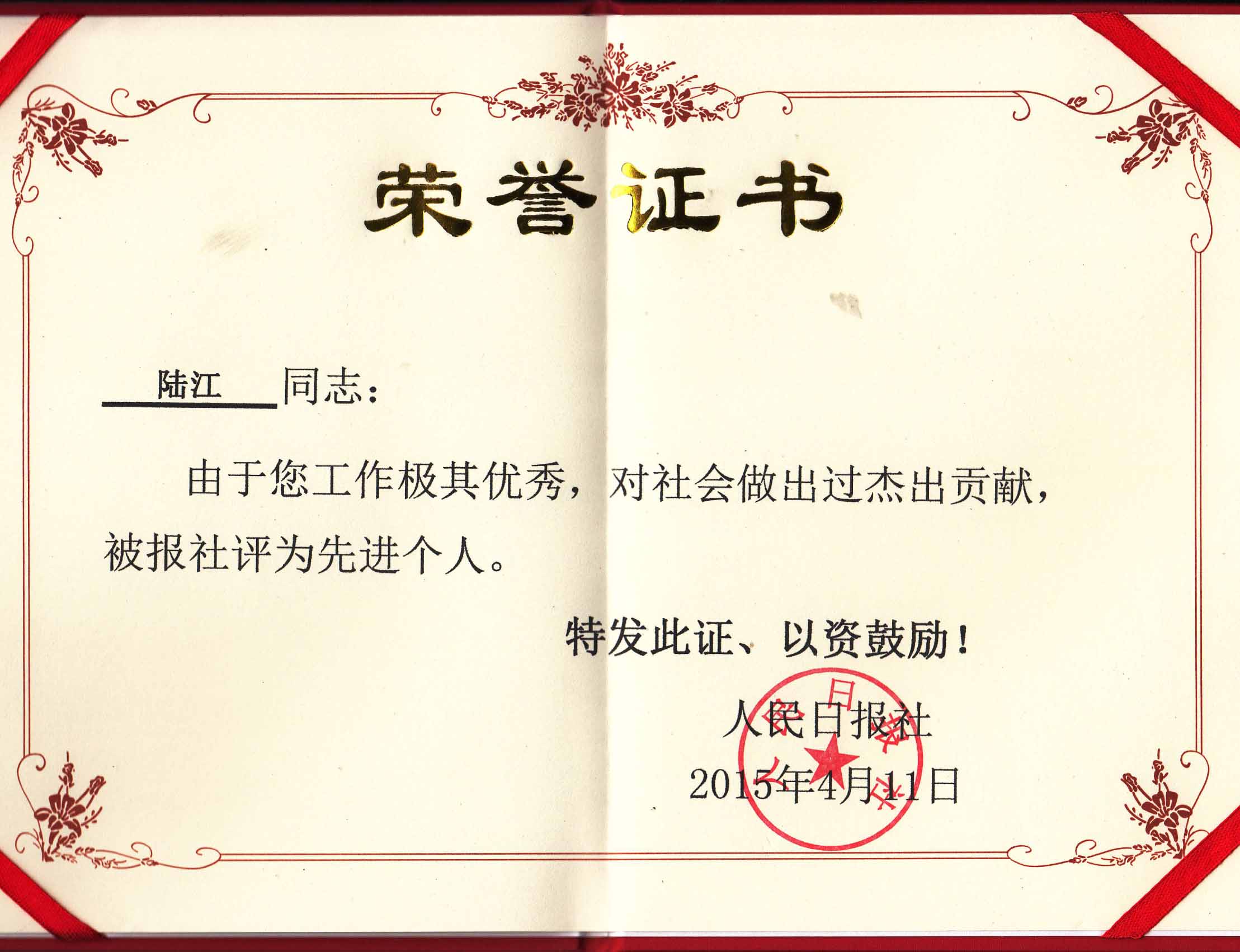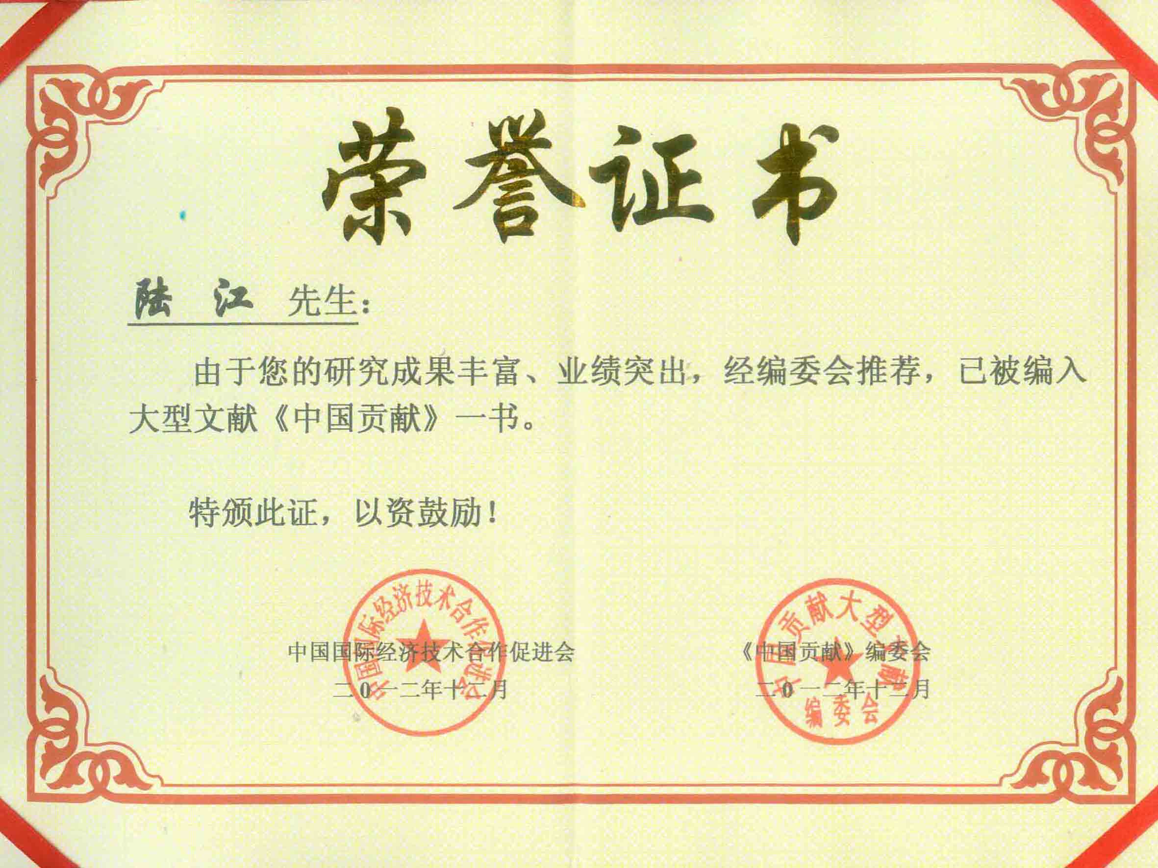 陸江的論文獲一等獎榮譽證書-- 陸江論文獲創新論文獎牌